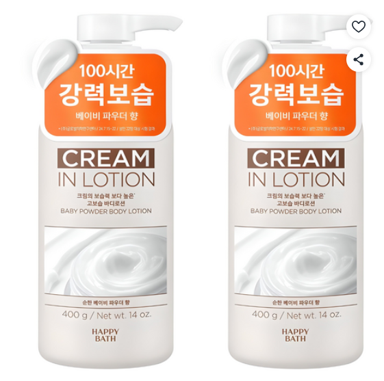 [쿠팡핫딜] 해피바스 크림인 고보습 바디로션 베이비 파우더향, 400g, 2개 (15,800원/무료)