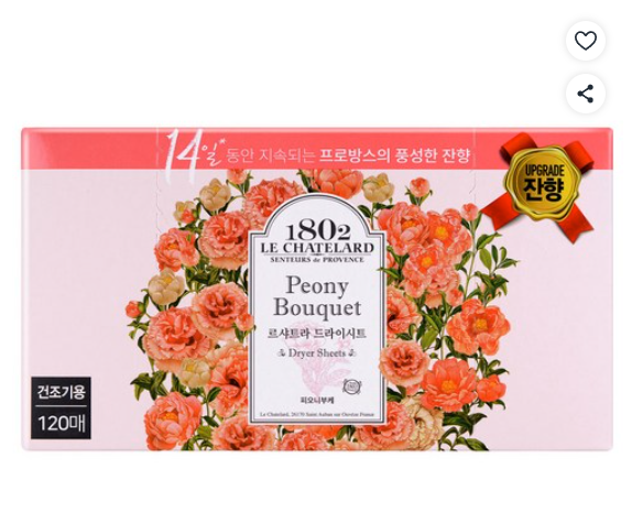 [쿠팡핫딜] 르샤트라1802 건조기 시트 섬유유연제 피오니부케 본품, 120개입, 1개 (10,380원/무료)